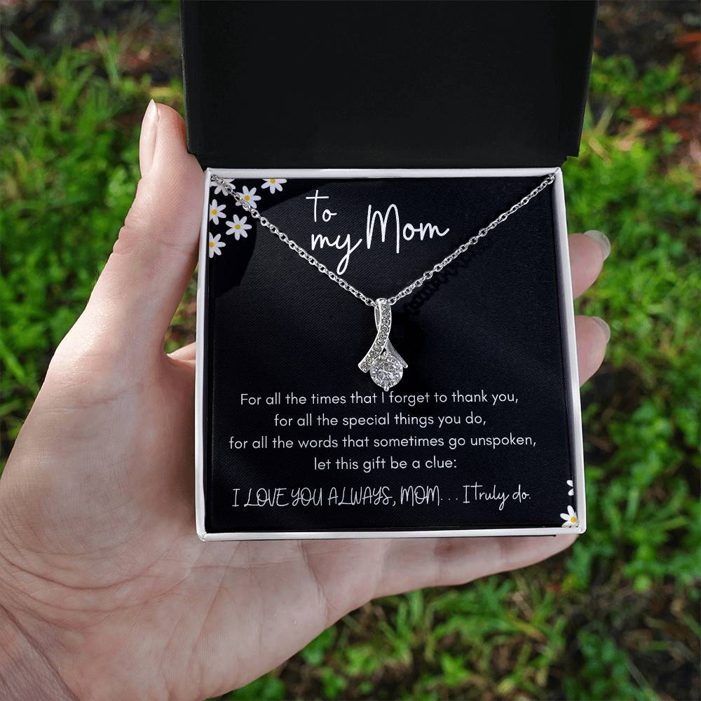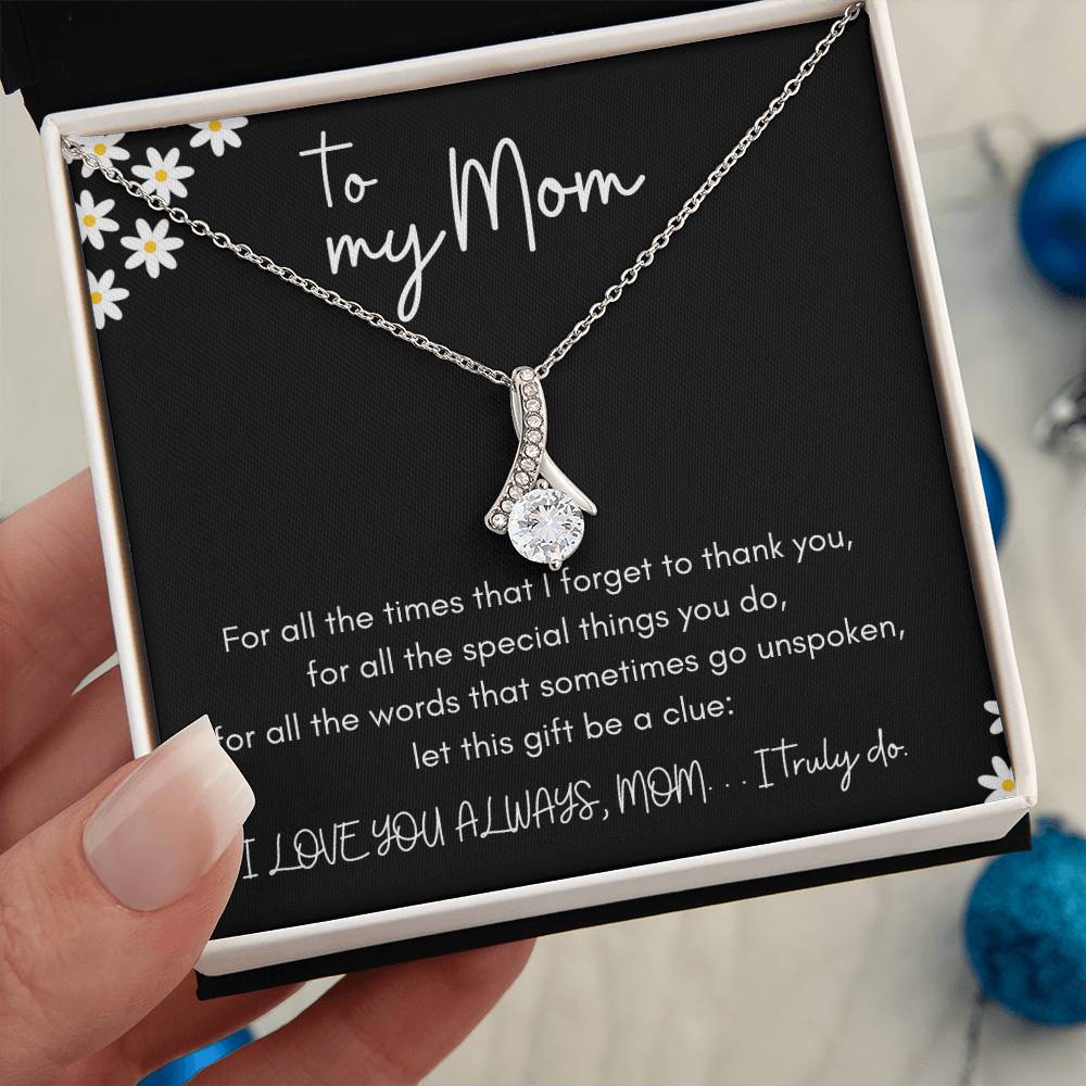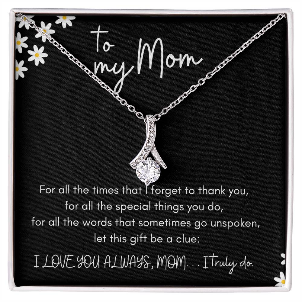 Imagine her reaction when she opens this stunning gift! The Alluring Beauty necklace features a petite ribbon shaped pendant that is sure to dazzle your mother. Whether it's a birthday or anniversary, make sure to get her a gift she will love for years to come.