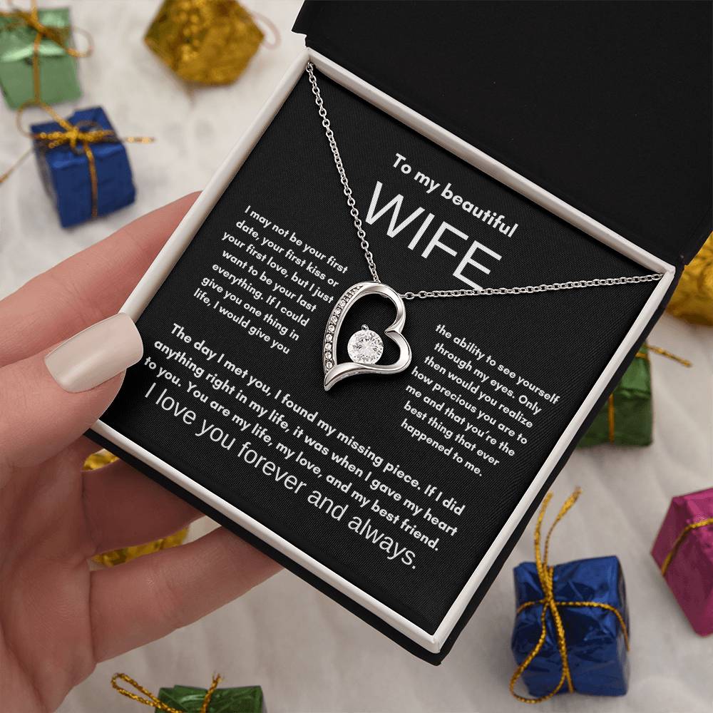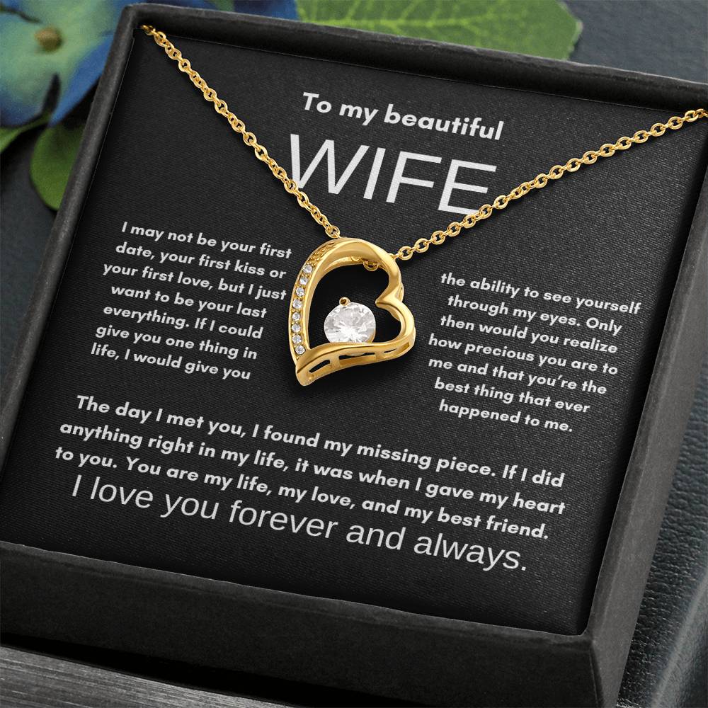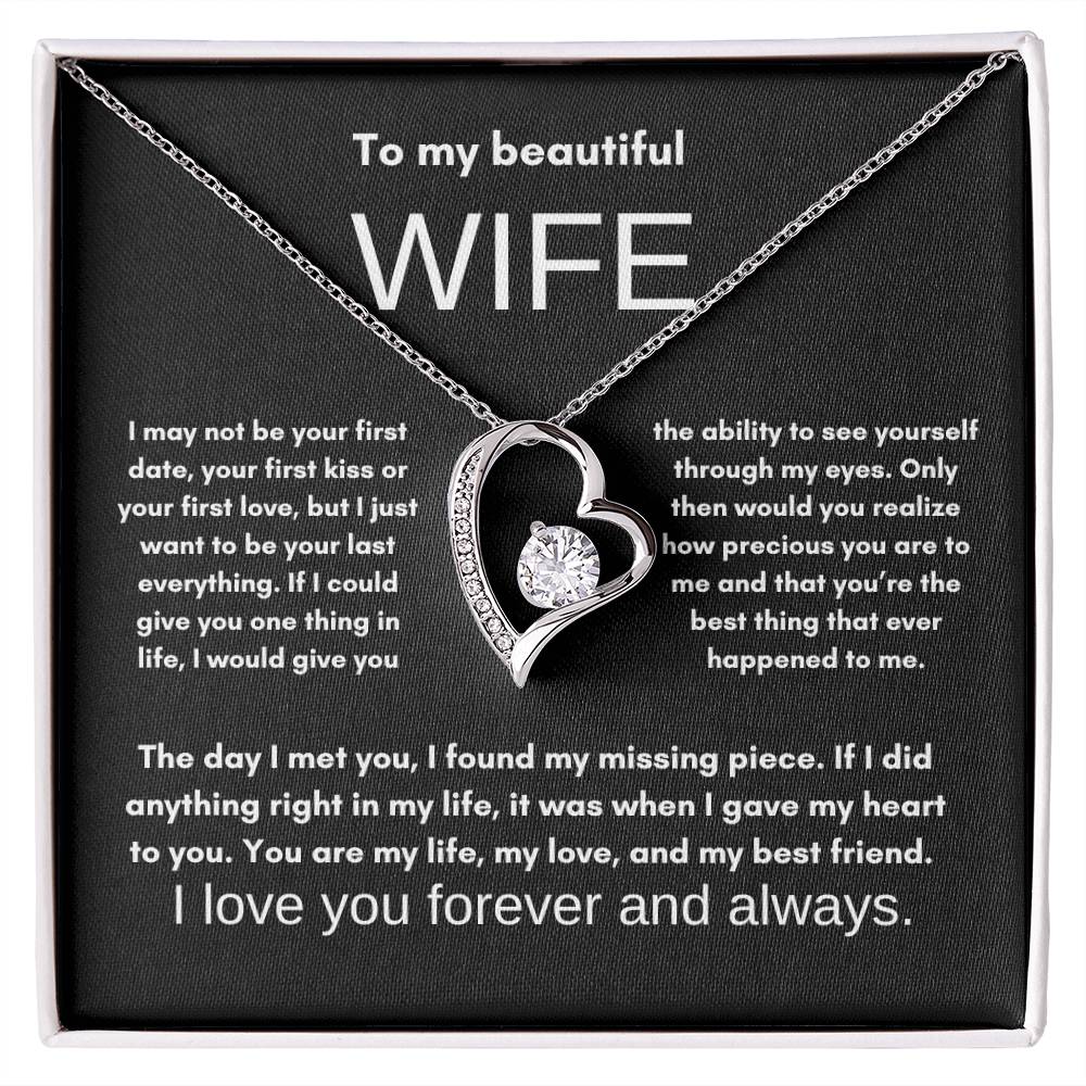 Message: To my Beautiful Wife: I may not be your first date, your first kiss or your first love, but I just want to be your last everything. If I could give you one thing in life, I would give you the ability to see yourself through my eyes. Only then would you realize how precious you are to me and that you’re the best thing that ever happened to me. The day I met you, I found my missing piece. If I did anything right in my life, it was when I gave my heart to you. You are my life, my love, and my best friend. I love you forever and always.